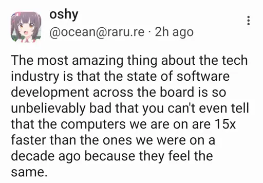 Right now, my laptop doesn’t have to run much. Just a combination of KDE, browser, emails, music player, a couple of messengers and some background services. In total, that uses about 9.5 GB of RAM. 20 years ago we would have run the same workload with less than 1 GB.