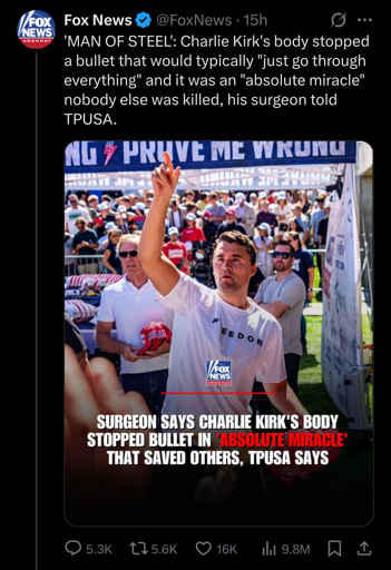 The shooter who went to a Charlie Kirk event, took one clean shot at Charlie Kirk, saw Charlie Kirk go sideways and left the scene? I wonder what their motive could have been, maybe they would have shot someone else if Charlie Kirk hadn’t been there to bravely catch that bullet.