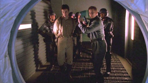 Once the derelict ship’s cargo is aboard, Serenity starts to leave, only to be stopped by an Alliance cruiser. Armed troops board the ship and find Mal and everyone but River and Simon waiting for them, the salvaged cargo plainly in sight to avoid accusations of theft. Alliance Commander Harken accuses them of harboring two fugitives and detains them for questioning.