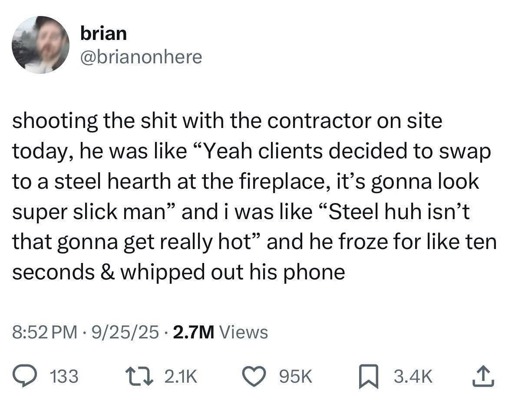 - Not to mention the fact that steel fireplaces are being manufactured for use in homes, so someone figured out how to keep it from causing issues. - yea just a thin layer of abestos - Asbestos is fine as long as it’s encapsulated. - While true, I’m sure a homeowner will eventually drill through it to hang something.