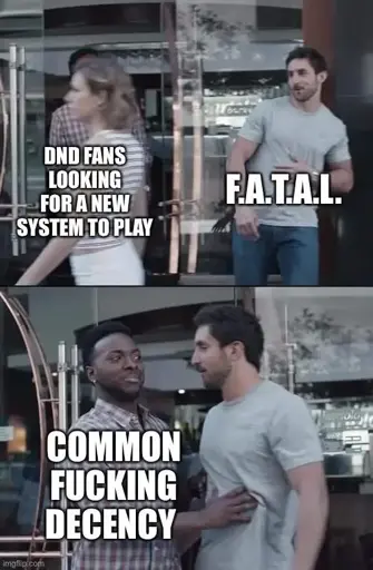 Shouldn’t the labels be swapped? Is common decency keeping F.A.T.A.L. from pursuing players? F.A.T.A.L. is antithetical to common decency. Decency keeps players away from F.A.T.A.L.
