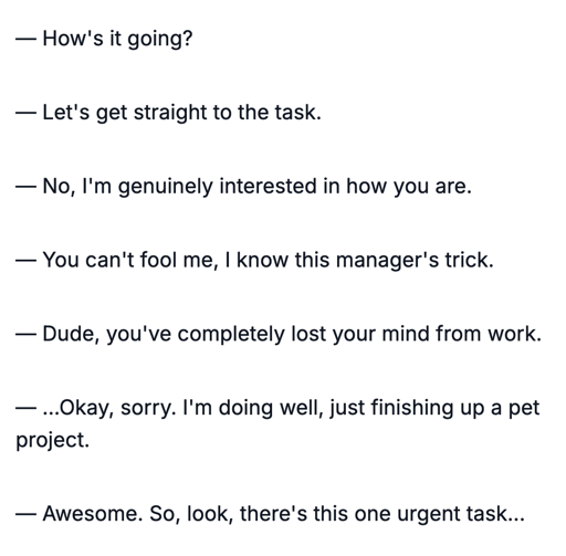 minus-squareNotMushroomForDebate@lemmygrad.mllinkfedilinkEnglisharrow-up2·edit-22 months agoIs this still the case? I thought this was slowly falling out of style, but maybe it depends on the place. More and more in my experience it goes something like: “How’s it going?” “It’s going” “Yeaaah…”