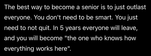 Literally me right now in my job after two years. Projet Owner left, Tech Lead left, two Devops engineers left… I was supposed to be just a Dev and instead I end up doing a bit of everything. Fucking crazy. Coincidentally, I’ve never been in a job for more than two years…