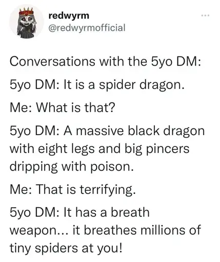 Stamets@lemmy.dbzer0.com to RPGMemes @ttrpg.network · 28 days agoSpider Dragon...lemmy.dbzer0.comimagemessage-square47linkfedilinkarrow-up1721arrow-down110
