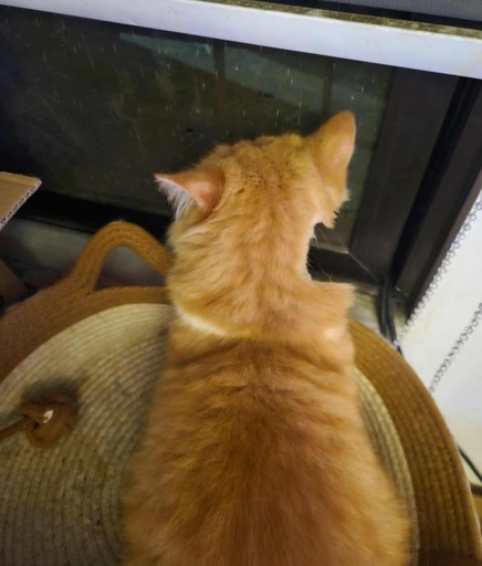 A picture of an orange cat from above, on the right side of his neck a chunk of fur is missing, making him look like someone took a bite out of him.
