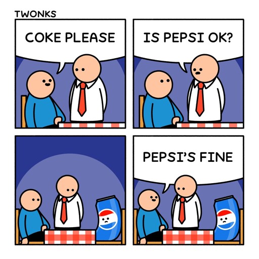 This reminds me of the time I went on vacation with my brother (solid coke only guy; ftr I don’t drink soda, I drink tea, that’s a whole other meltdown in similarity lol) and we wound up in a “1950’s” cosplaying shopping square. Coke memorabilia EVERYWHERE. My brother was dying cause all the stores and restaurants we’d been to were Pepsi only. He excitedly goes into the convenience store with a display window full of coca cola bottles, a coca cola fridge and a COCA COLA SOLD HERE sign.
