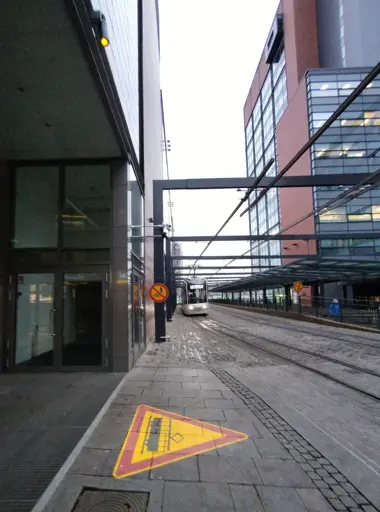 The tram line has been open for about two years now, but people still have trouble remembering the tram has the right of way. Maybe this will help, the audible warning doesn’t seem to be enough since many people have headphones (understandable, noise cancelling is a must if the city has any car traffic).