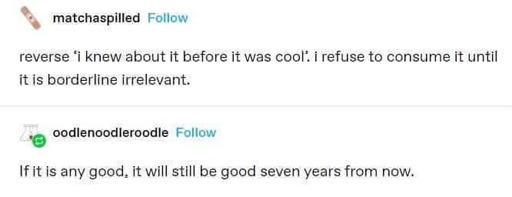 That’s not what I meant, though. If it’s popular I’ll never care, I’m not gonna wait til people have moved on amd then check out, I’m just not interested in many popular things.