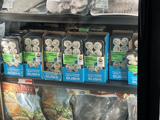Yes there is a walmart, but only one actual grocery store, and it now stock frozen sushi.
