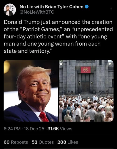 “There was no indication the Patriot Games would pit competitors against each other in a fight to the death, as of this writing.” Lmaoo