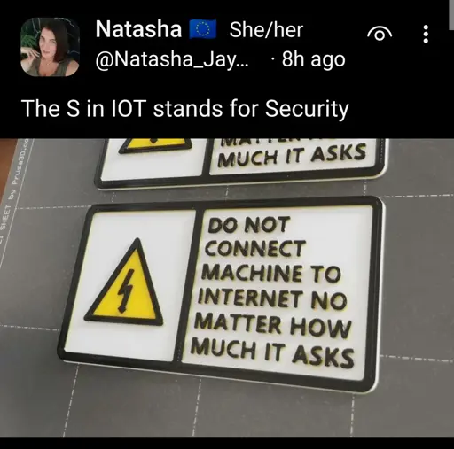 minus-squarezqwzzle@lemmy.calinkfedilinkEnglisharrow-up15·18 days agoNot the exact same but https://www.printables.com/model/1327860-do-not-connect-machine-to-internet-sign