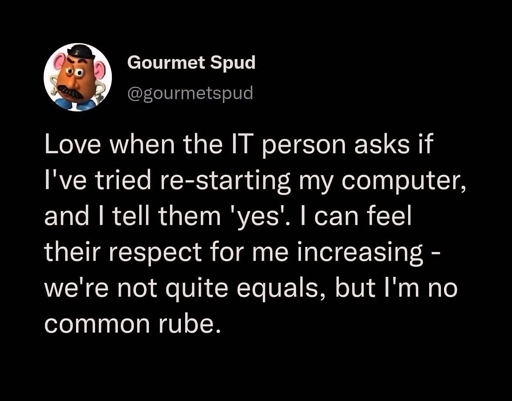 i once asked a kid if he turned the laptop off and on again, he said yea. so i started to try to fix the issue, nothing worked. so i decided to reboot anyway and it worked. ive never trusted anyone who responded yes to this question again