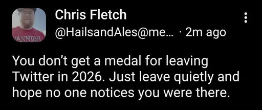not_IO@lemmy.blahaj.zone to Microblog Memes@lemmy.worldEnglish · 7 days agowhat are people still doing on twitter?lemmy.blahaj.zoneimagemessage-square80linkfedilinkarrow-up11.24Karrow-down17file-text
