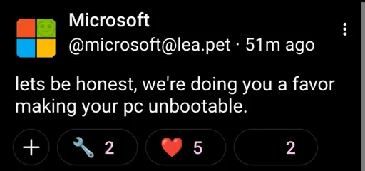 Lmao I’m over here literally right now backing up, wiping, and reinstalling windows because the fucking in-place upgrade system is hanging at like 90% completion on referenced files that aren’t necessary (user created) but that it can’t find, so instead of fucking ignore them it just nopes out and does fuck all. I’ve been passively trying to fix this for about 18 months, actively for the last 4 days.