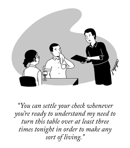 Ok then why do waiters always make it SO FUCKING HARD TO LEAVE?! Most of the time, I wind up waiting for the check to show up, often I have to flag someone down to get it.