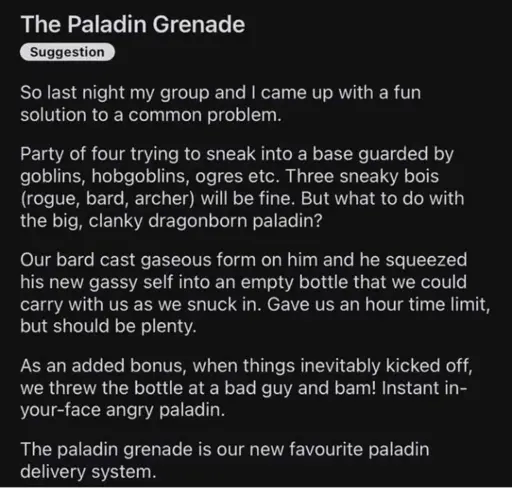 But it’s the same number of protons, so it’s gonna be just as heavy. Even if you can squeeze all those molecules into a small-ish container, it’s gonna have the weight of the paladin, his armor, and his dragon.