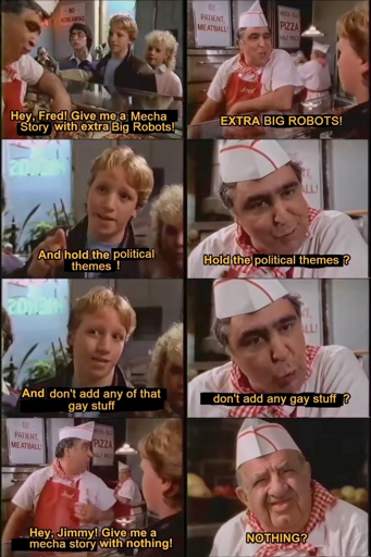 A show about big fighting mechs isn’t complete if the pilots aren’t gay and in love and hate each other and exclusively communicate through monologues of their ideals on the current political climate.
