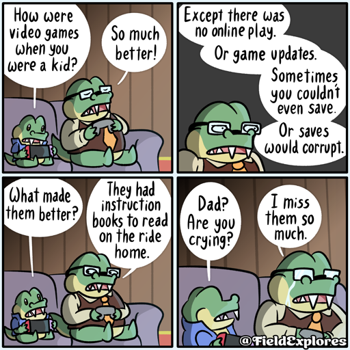 Anyway, none of this is intended to convince you to be a retro gamer like me. You love what you love and hate what you hate. I just hope it’s a little bit clearer why folks like me have all this nostalgia, as depicted in the comic.