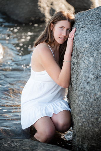 Ah, F2.8 is fine. The background being blurred out is good because the focus should be entirely on the model. You could stop down or use a strong ND filter and try and do a long exposure to get the water nice and blurry.
