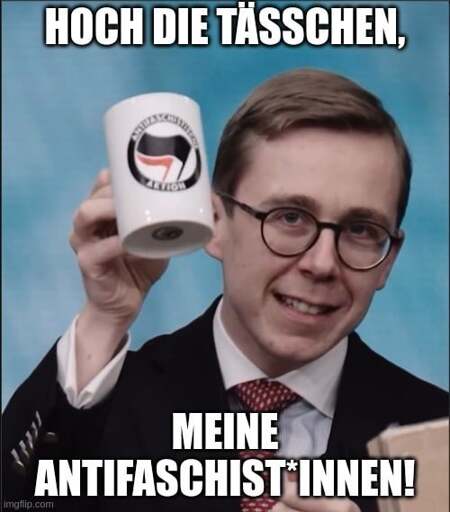 Ah, so was in der Art hatte ich mir gedacht - wobei ich schon in Sorge war, dass er die Tasse am Ende bei irgendeiner Konferenz in dem Bild als Beweis für irgendwie eine Art zentraler Antifa GmbH benutzen würde, die mit Staatsgeldern diese Tassen produziere. Mittlerweile kann man sich ja nicht mehr sicher sein.