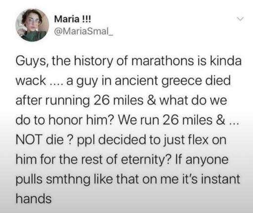 Hadn’t the person already done a bunch of running before they set off on the marathon run? It’s been a while since I read about it, but I do remember there being more to the story.
