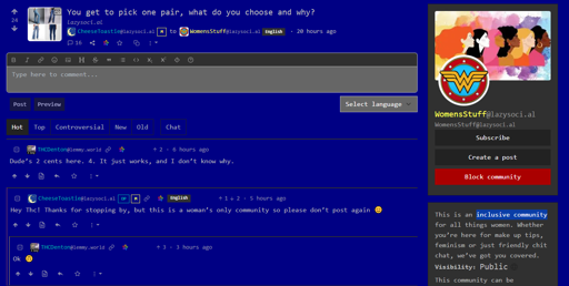 Inclusive doesn’t mean they let everybody in regardless, I understand you were trying to help but they’re asking women’s opinion in a women community and you start with “hello I’m not a woman but” 😅