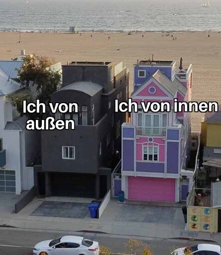 Es erinnert mich an Gru und seine finstere Behausung aus dem Film Ich – Einfach unverbesserlich. Auch dort wohnen seine Nachbarn in deutlich helleren, freundlicheren Häusern. Obwohl ich finde ja das rechte Haus irgendwie kitschig. 🏠