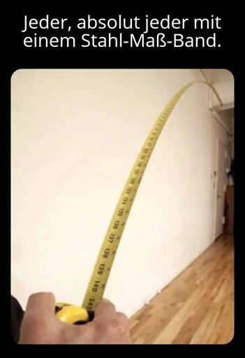 minus-squareDeLancre@feddit.orglinkfedilinkDeutscharrow-up4·7 months agoIch mach das auch mit nem Meterstab. Man muss ja nicht gleich übertreiben.