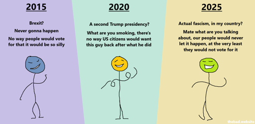 [2025] Actual fascism, in my country? Mate what are you talking about, our people would never let it happen, at the very least they would not vote for it