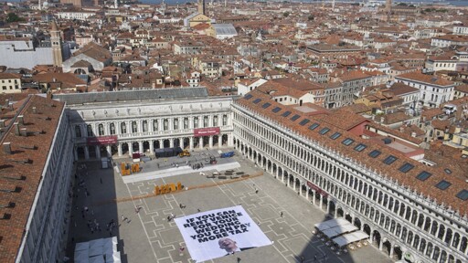 A half-dozen protesters unfurled a giant banner early Monday in St. Mark’s Square reading: “IF YOU CAN RENT VENICE FOR YOUR WEDDING YOU CAN PAY MORE TAX.” Local police quickly folded it up and took it away.