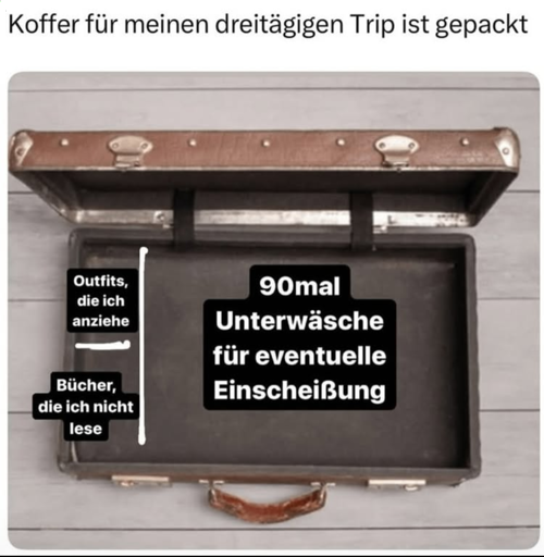 minus-squareFlipper@feddit.orglinkfedilinkarrow-up15·4 months agoLuggage for 3 day trip: Top left: Outfits I wear Bottom left: books I won’t read. Right: 90x underwear in case I shit myself
