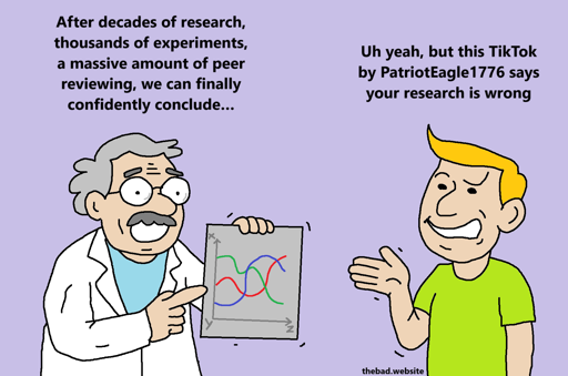 [smug dude with a ridiculous hairstyle] Uh yeah, but this TikTok by PatriotEagle1776 says your research is wrong